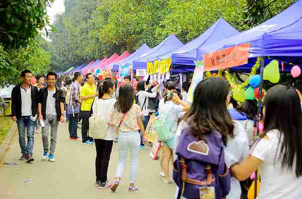 10月12日,我校一年一度的百团招新在电信路口至八教道路举行,全校129个社团集体亮相,其中隶属于best365官网的12个社团在此招才纳新。整齐划一的深蓝帐篷、五彩缤纷的海报、拿着喇叭高声介绍的社团成员和带着兴奋好奇目光四处张望的新生构成了火爆的百团招新场面。各个社团使出浑身解数,吸引新生的加入。
