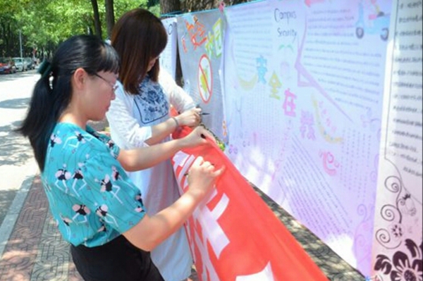 本次安全教育系列活动分为,手抄报征集、优秀手抄报以及安全图片展览、下寝宣传和安全知识竞赛四个部分进行。活动旨在传播安全知识,让大家加深对安全知识的了解,给同学们的生活提供一些便利,让更多的意外都防范与未然。活动现场,治保部也准备了一些活动,签名活动,在禁摩禁电拒校贷的横幅上签名,可获得一次抽奖的机会。许多同学积极参与,加大了宣传的力度。曾练武强调,安全教育是每年都会有的活动,但是如何做好,如何加大宣传力度,如何体现出我们学院的特色,如何让每个学生都能深刻的明白安全问题的重要性,这是我们所要思考和克服的。随后,辅导员亲切与委员们交流,并在横幅上签字。