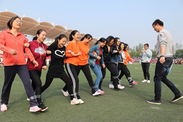 比赛开始前,教职工们就跃跃欲试,尝试着十人十一足的前行,争取能在比赛中获得优异的成绩。)出发号令一响,老师们立即卯足了劲,伴随着整齐划一的口号声,步伐一致,一往无前地冲向终点,一展激情与活力。
